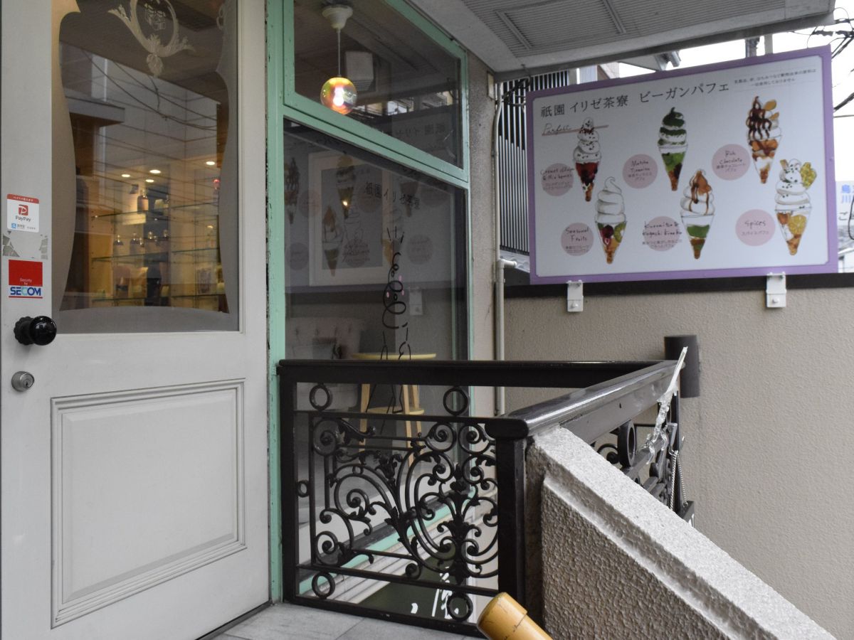 京都祇園石段下、八坂神社前の東大路通りを南へすぐ。外階段から2階に上がったところがビーガンカフェ「祇園イリゼ茶寮」です。パフェのかわいいイラスト看板を目じるしに、すぐにお店を見つける事ができます。