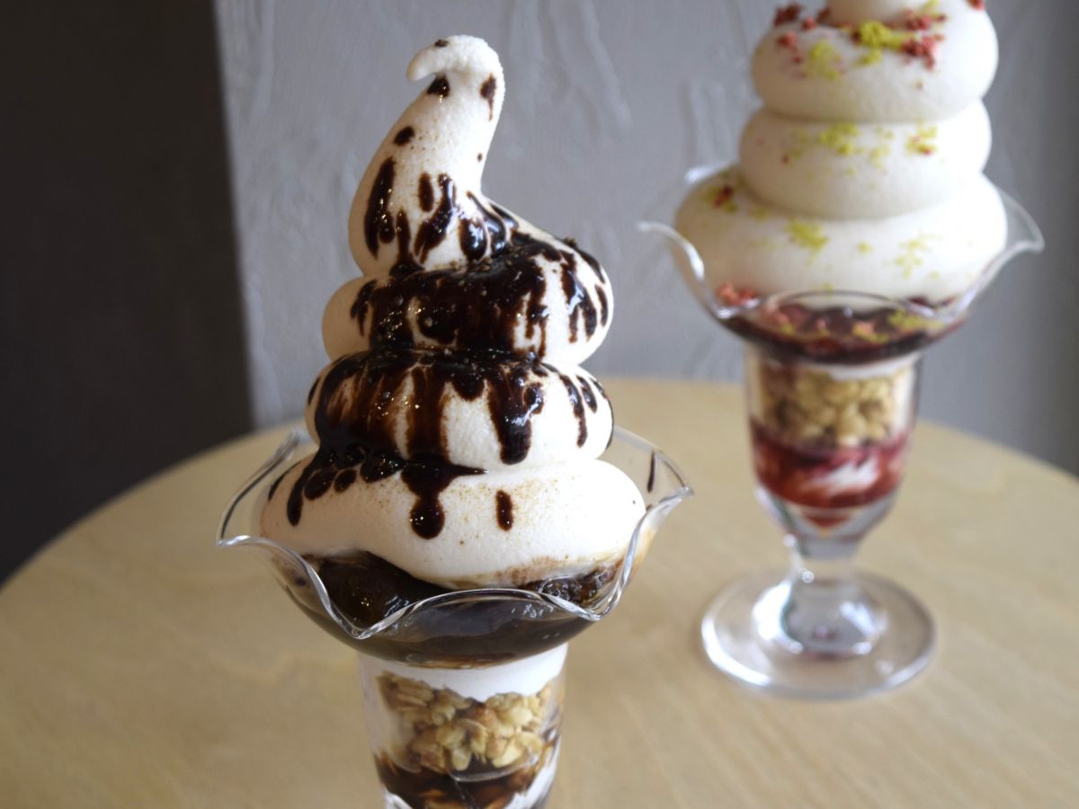 ビーガンパフェは、濃厚チョコレートパフェ、クレメダンジュとミックスベリーパフェ、抹茶ティラミスパフェ、スパイスパフェなど全6種類。ビーガンなのに、たっぷりのソフトクリームにびっくりですが、実はこれ、ベースは豆乳なんです。さっぱりとしたベースに、アーモンドミルクとカシューナッツを合わせて味に深みを加えています。