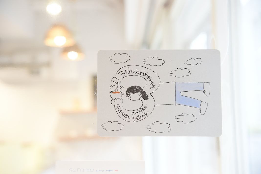 こちらは、「sorama coffee」が3周年を迎えたときに、アーティストの「KENTARO TOMOZAWA」さんがお祝いで贈ったイラスト。多くの人に愛されているカフェであることが、至る所から伝わってきます。一度訪れれば、そのファンの多さにも納得です。