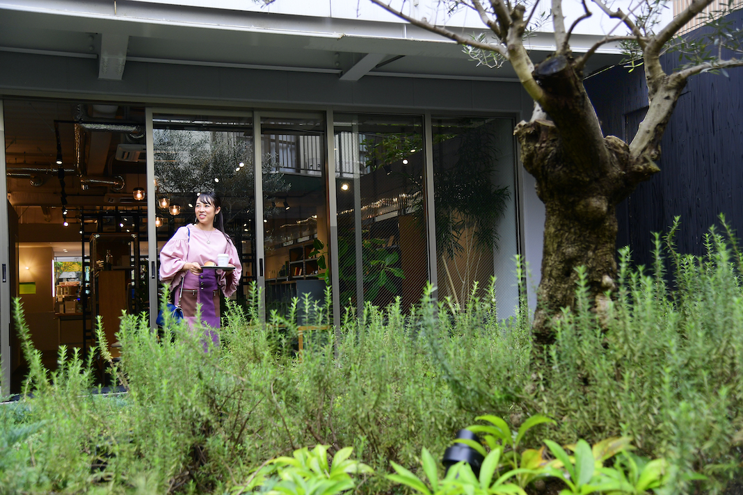 店内にも文房具棚に囲まれた席がありますが、今回は、お店の奥へ。緑豊かなテラス席が広がっているんです!