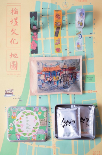 迪化街の南側入口にあるこちらのショップは、台湾らしいMIT雑貨を豊富に揃えています。写真上からマスキングテープ(NT$120)、中央は迪化街イラストの耳掛式コーヒー(NT$60)、下は烏龍茶ティーバッグ(NT$160)。おみやげに持って帰りたい品に、きっと出合えます。