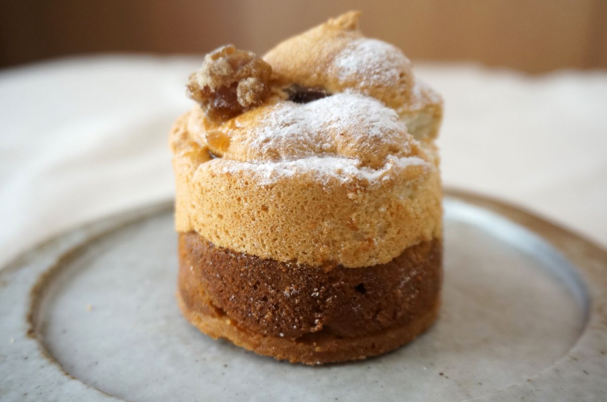 土台はクッキー生地とダマンド生地、中には洋酒が香る濃厚なマロンクリームと渋皮栗が丸ごとひとつ隠れています。クリームが絞られるようにトップをケーキ生地で覆って、見た目もしっかりモンブランをイメージ。洋酒の効いた栗の風味がとっても豊かで、焼き菓子なのに正真正銘!モンブランの味わいが口いっぱいに広がります。