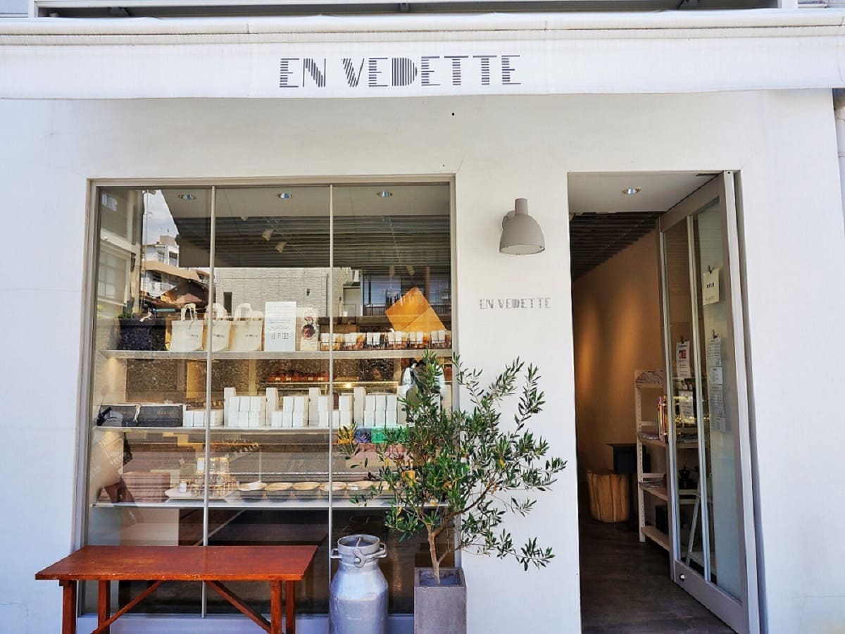 清澄白河駅から徒歩6分、オリーブの植木が目印のスタイリッシュなお店が「EN VEDETTE(アン ヴデット)」です。店内の色合いはとてもシンプルで、白を基調とした落ち着いた雰囲気。だからこそ、ショーケースに並ぶカラフルなケーキが目を引きます。