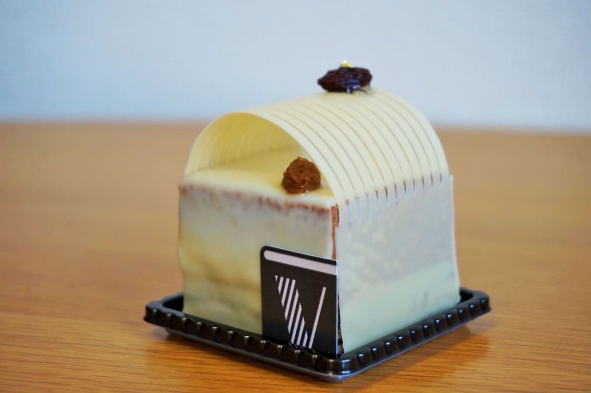 「フォンド・レザン」は、アーモンドがたっぷり使用されたケーキ。ラムシロップがたっぷり染み込んだしっとり生地の上に、バニラ風味のバタークリームとラムレーズンをオン。さらにその上から、サクサクのダックワーズでサンドしています。