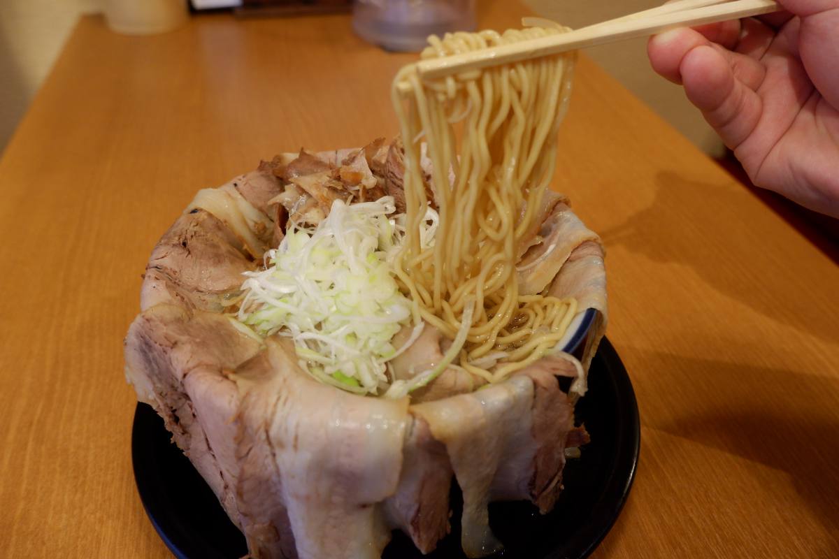 いざ実食。積み重なったチャーシューの山を掻き分けてようやく麺に到達。豚や魚介、野菜などのだしをベースにした旨味たっぷりのスープが細麺とよく絡まり、絶品です!しょう油にたっぷりと漬け込んだ自家製チャーシューと麺を交互に食べると、ジューシーなチャーシューの旨味とモチモチの麺の食感に箸が止まりません。実は体にやさしい無添加にこだわって作られたラーメンなので、ハメをはずしたい日にぴったりです。
