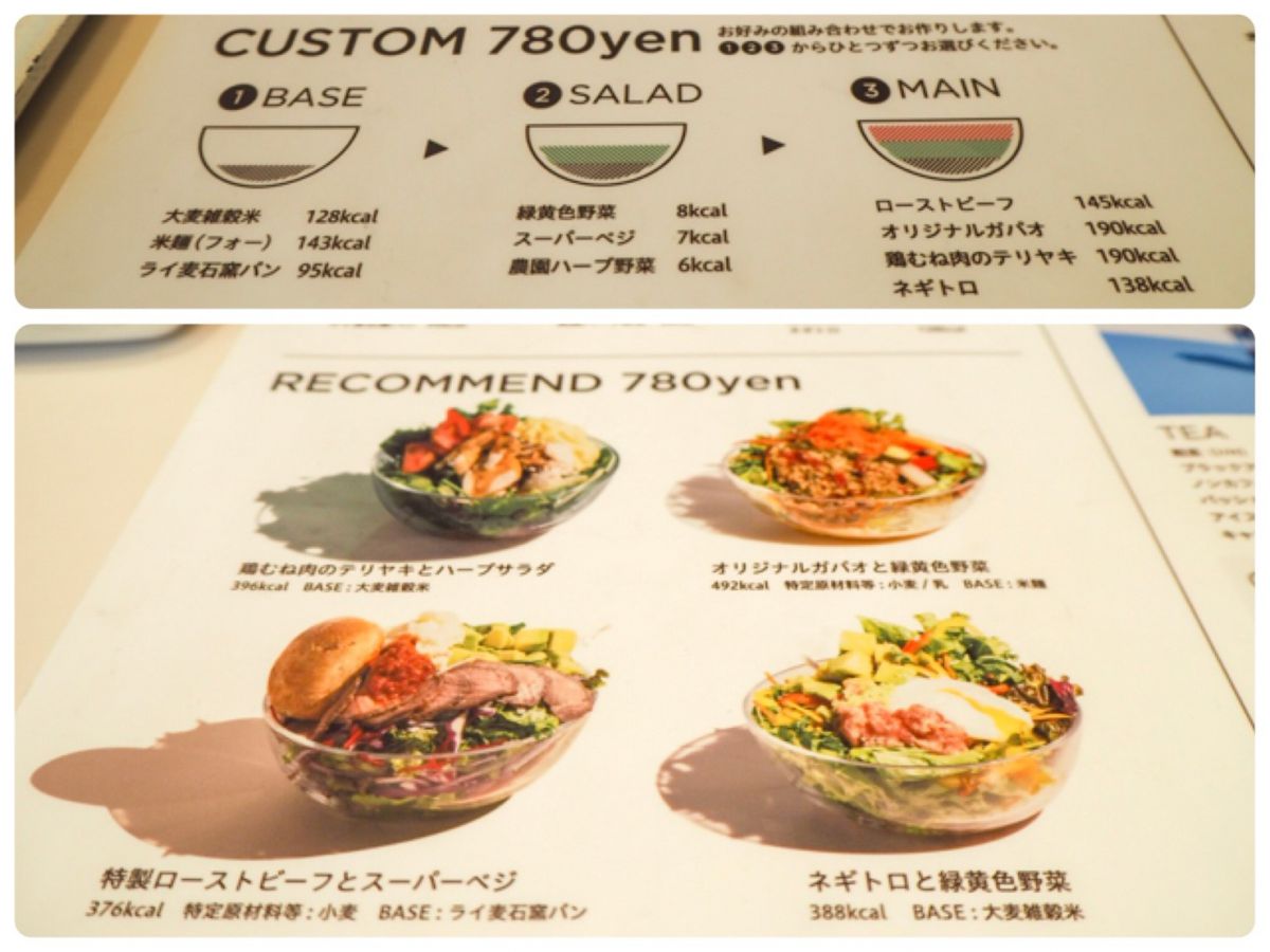 「COSTOM」は、まず「ベース」「サラダ」「メイン」の3つを組み合わせます。ご飯や麺などの「ベース」の上に「サラダ」をのせて、「メイン」となる具材をそれぞれ選んでカスタマイズ。どれにするか迷って決めきれない人は、「RECOMMEND」4種類の中から注文しましょう。