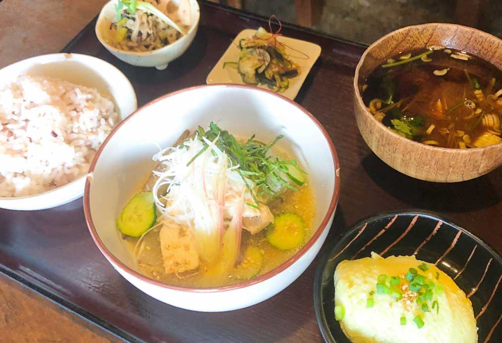 こちらは要チェックの野菜たっぷりの「一汁三菜セット」(1058円)。主菜と自家製豆腐、副菜、漬物と、このために特別に調合した赤だしの味噌汁がついたヘルシーなメニューです。最近野菜が足りていないな…という時に食べると体が喜びそうな品々です!