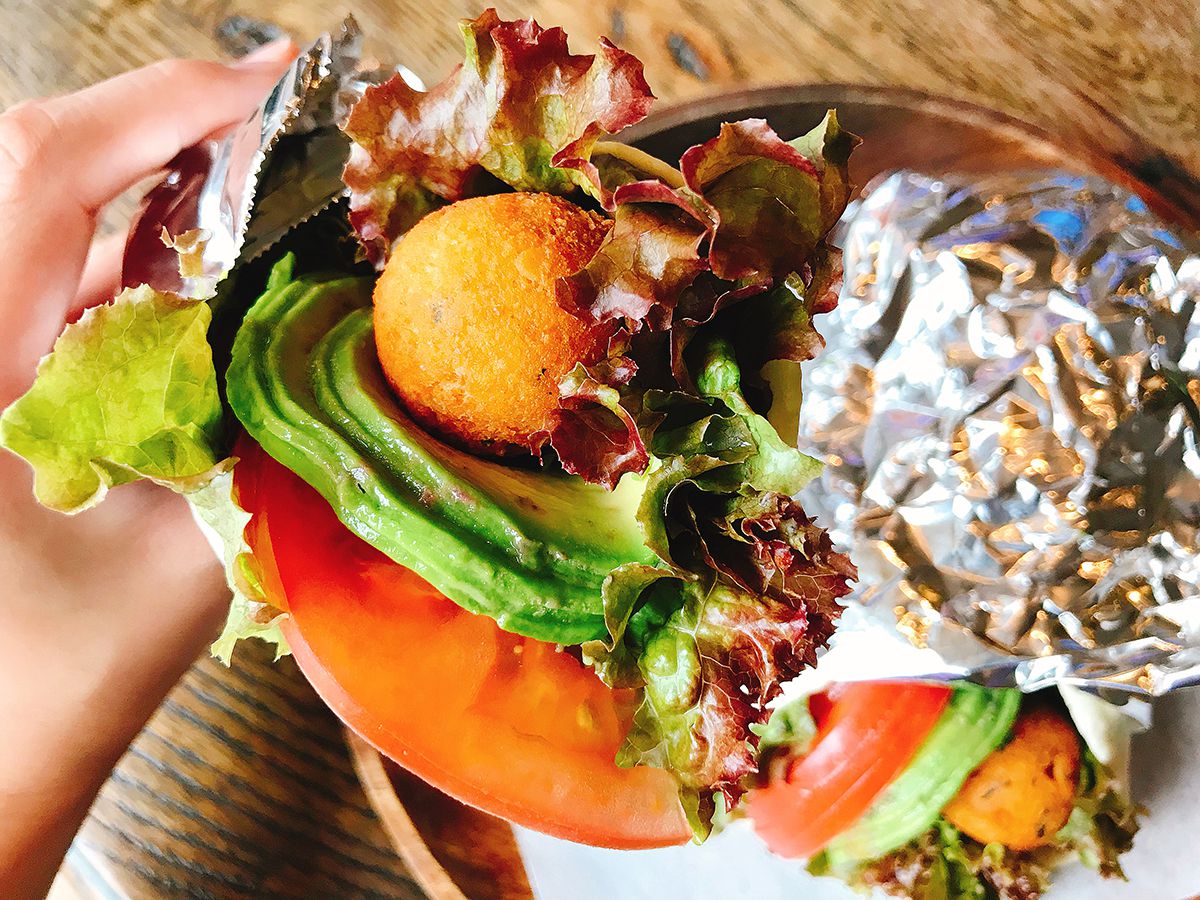 こちらは、中東料理のファラフェルをトルティーヤで巻いた「ファラフェルサンドイッチ」。ひよこ豆にタマネギやパセリ、クミンなどの香辛料を利かせて揚げたファラフェルは、スパイシーでクセになる味わい。