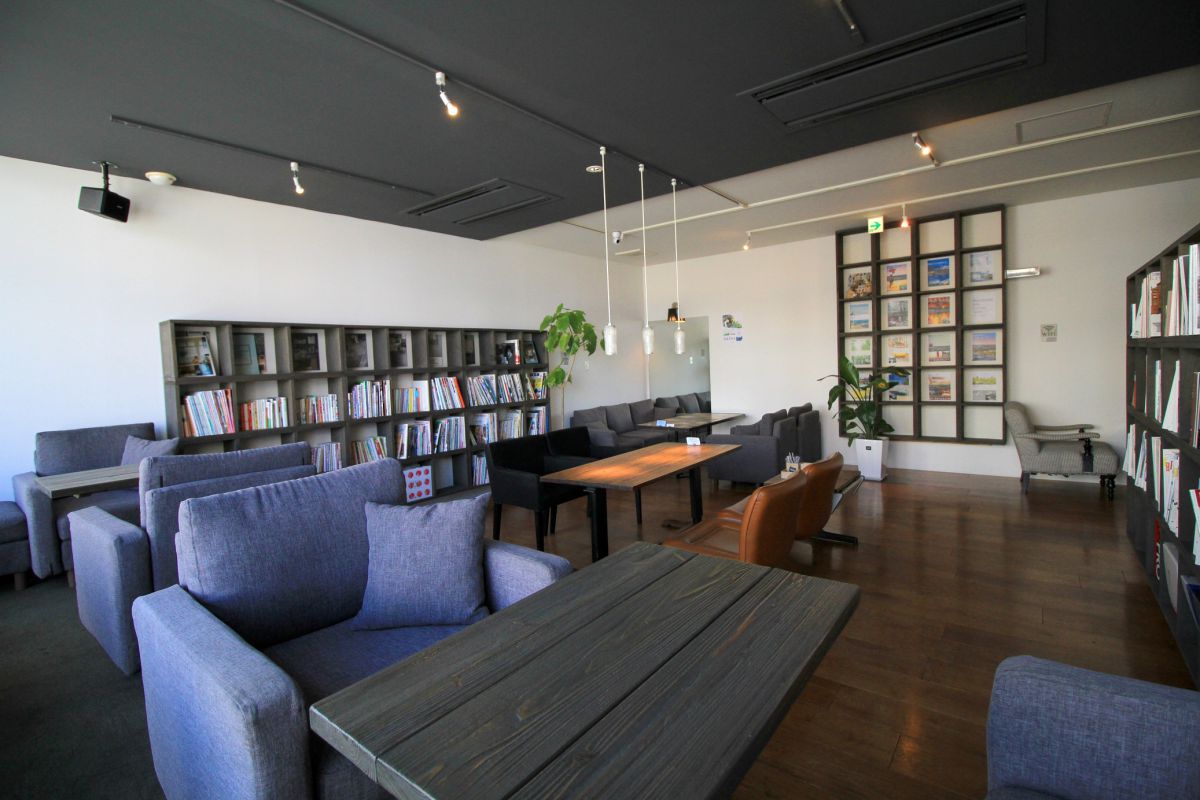 店内は洗練されたインテリアカフェのよう。テーブルやイス、ソファーも上質なもので、ゆったりとくつろげ、本棚にある本は自由に読むことができます。1階と2階からなり、2階席(写真)からは外の風景を眺めることができます。