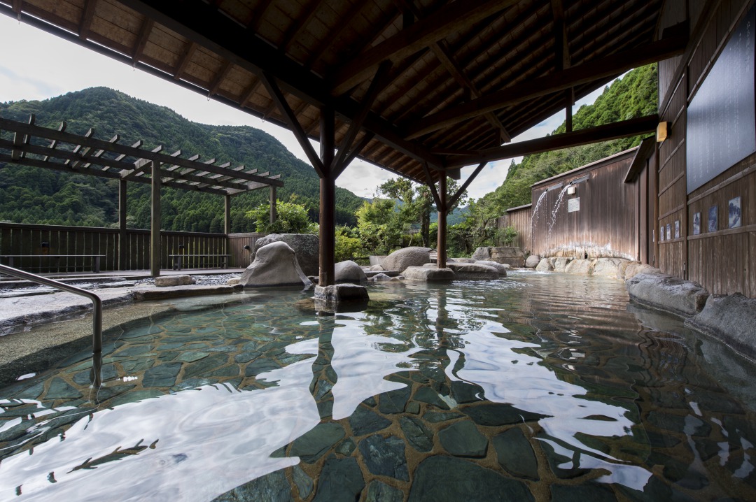 お風呂は古湯特有のぬる湯。約38度という心地良い温度ととろみのある泉質で、のんびりくつろぐには最適です。すぐそばを流れる川のせせらぎを聞きながら体の芯まで温まった後は、部屋に戻って読書の続きを楽しみます。