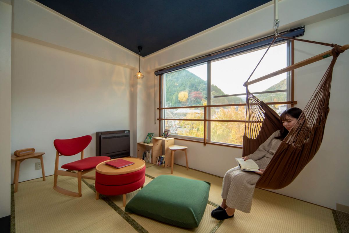 窓から見える山の自然を楽しみつつハンモックで大好きな読書なんて、最高の癒し!思わず時間を忘れて没頭してしまいそう。