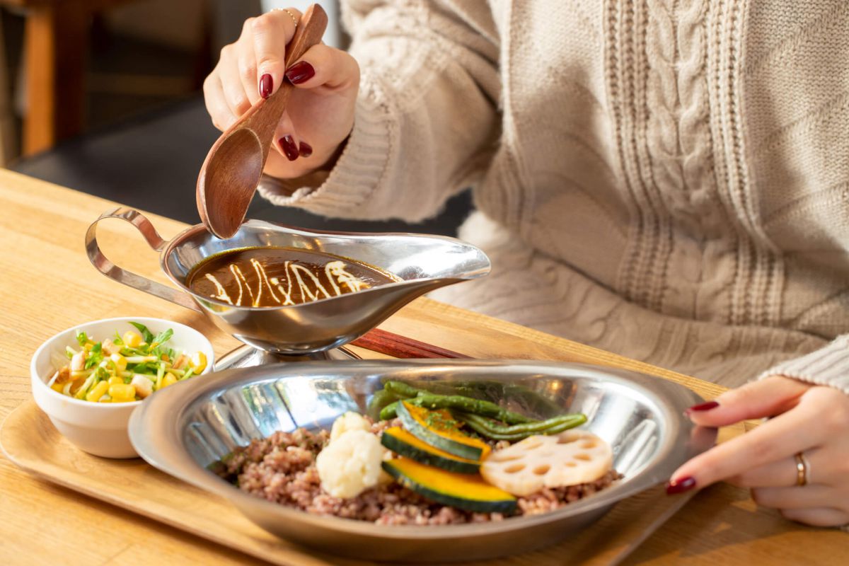 そして、ここが居心地良い理由は、フードメニューの充実にもあります。特に人気のカレーは野菜をふんだんに使っていて、玄米と黒米をミックスしたご飯にかけていただくヘルシーさがうれしいです。私は「温野菜カレー」(1030円)をチョイス。30種類以上のスパイスを使い10時間煮込むというだけあって、奥深くて良い香り!ボリュームはあるのにさっぱり食べられます。こんなに本格的なランチも食べられるなんて、近所にあったら毎日でも通いたい!