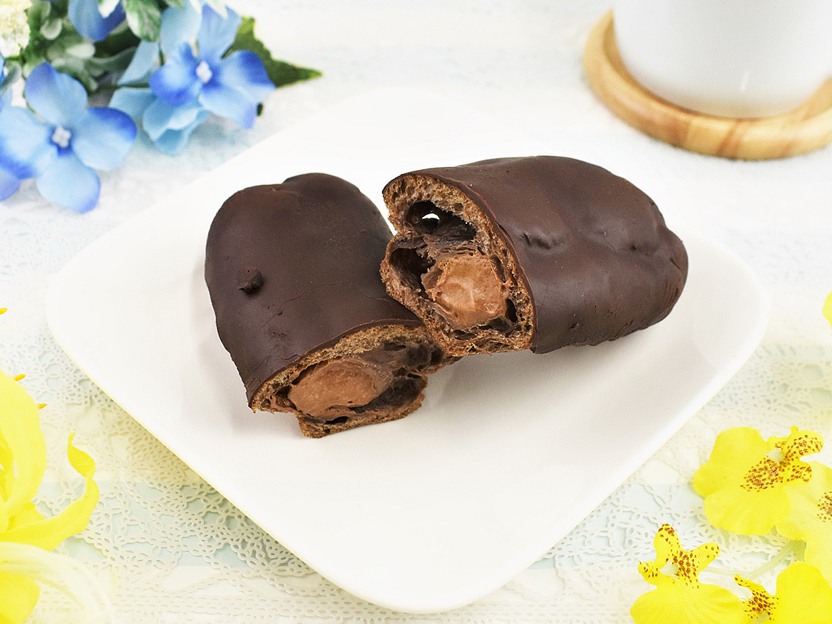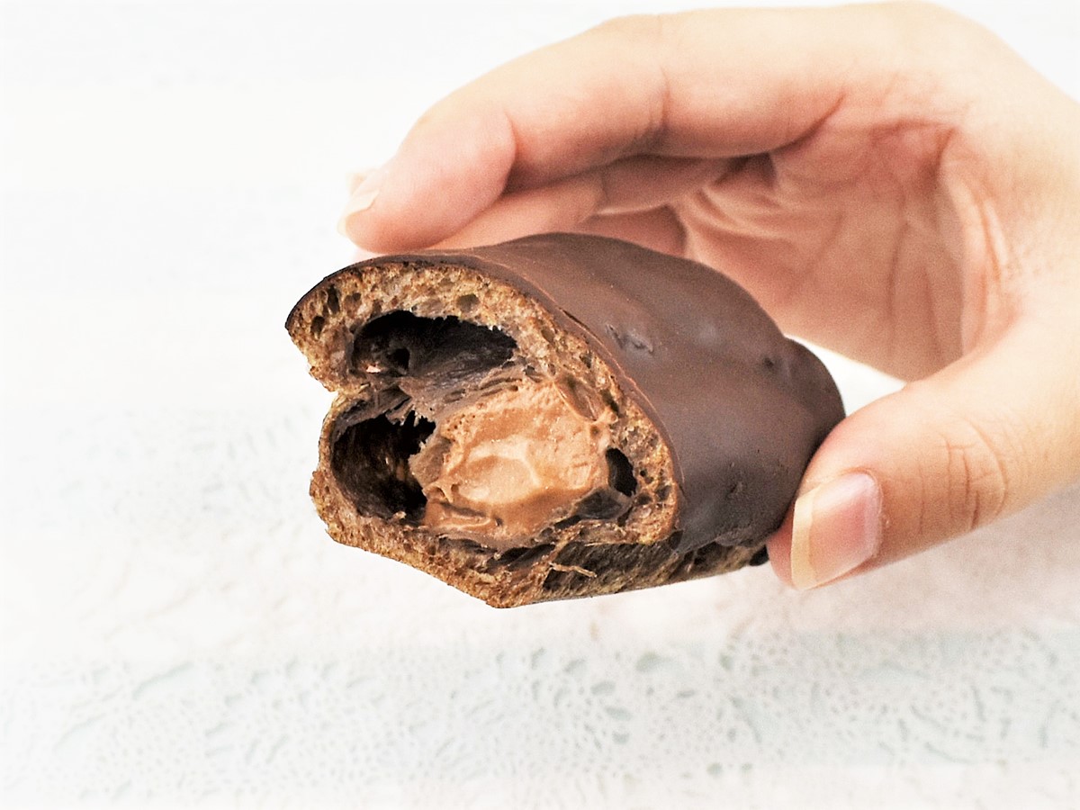 さてオリジナルのチョコレートについて理解を深めたところで、さっそく実食していきましょう! まず一口食べてみると、美しくコーティングされたチョコレートから少しビターな味が。濃厚なチョコレートクリームもほんのり苦味を残しているので、リッチな味わいがクセになります。おまけに外のシュー生地はパリッと、中にはとろとろのチョコレートがたっぷり。甘さ控えめなところが女性からはもちろん、男性からも支持されそうですね。