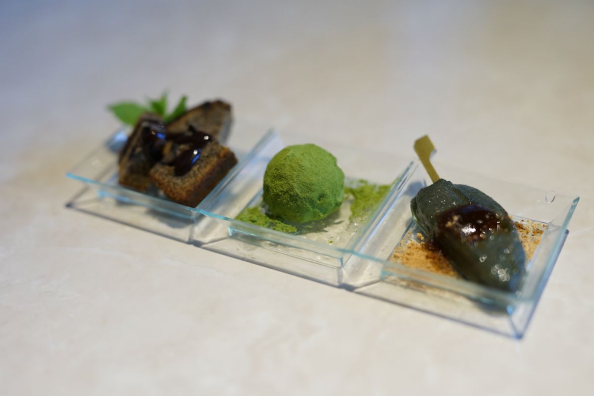 「玉手箱スイーツ」では「茶筅」を代表するさまざまなスイーツの盛り合わせになっています。季節や日によって内容は変わりますが、代表的なものをご紹介しましょう。こちらは、右から「焼き生麩」、「抹茶のトリュフ」、「ほうじ茶のパウンドケーキ」。