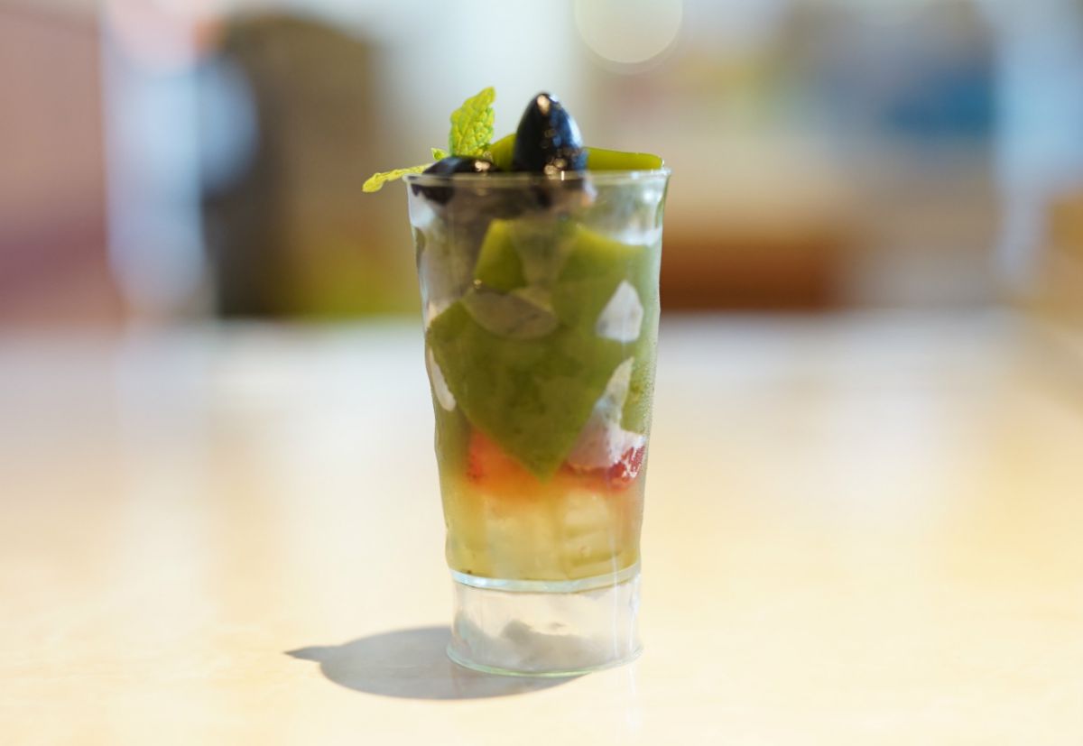 とろんとおいしい「抹茶ゼリー」は、黒豆をあしらって味わいにアクセントをもたせます。