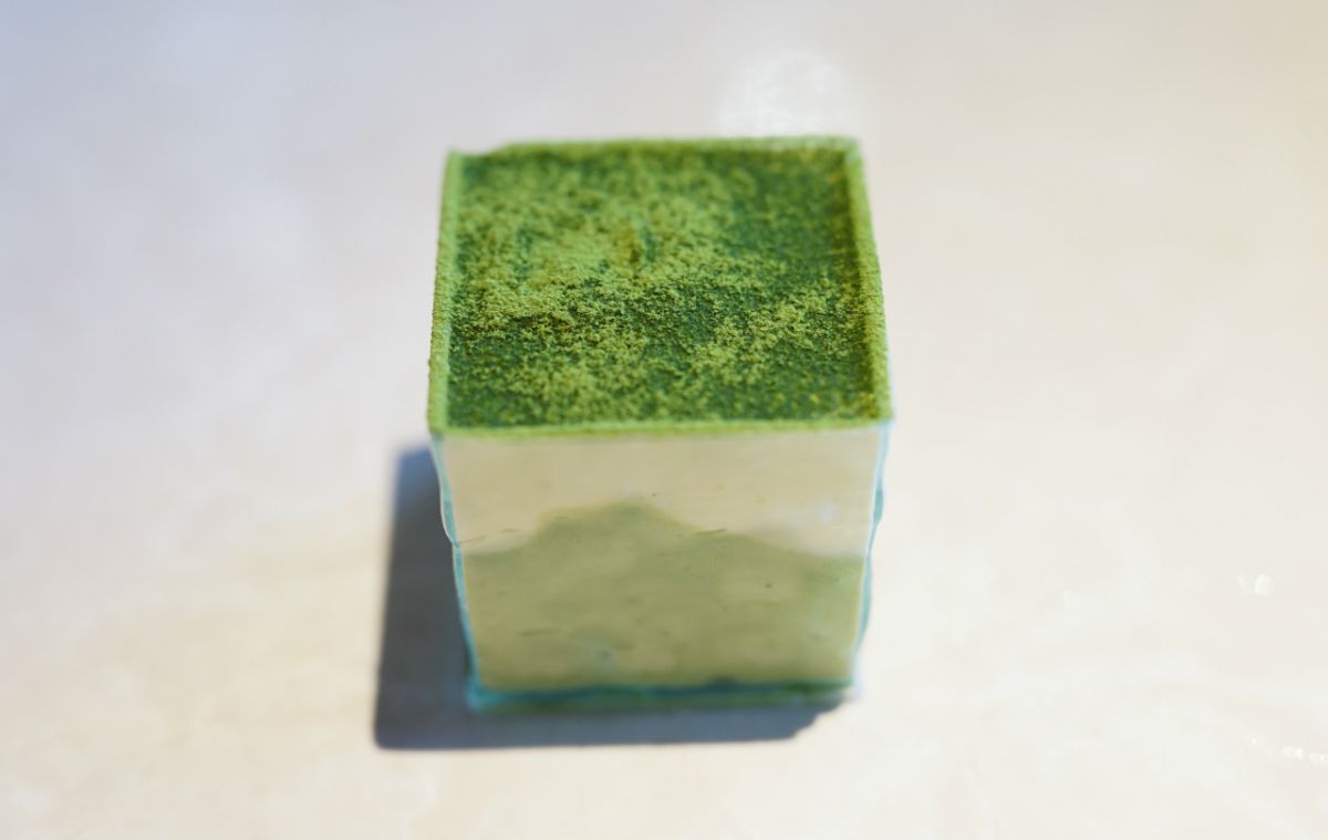 抹茶のスポンジを敷きつめ、マスカルポーネのチーズクリームと抹茶のムースを2層仕立てにした「抹茶ティラミス」。チージーなおいしさと抹茶の風味に酔いしれて。