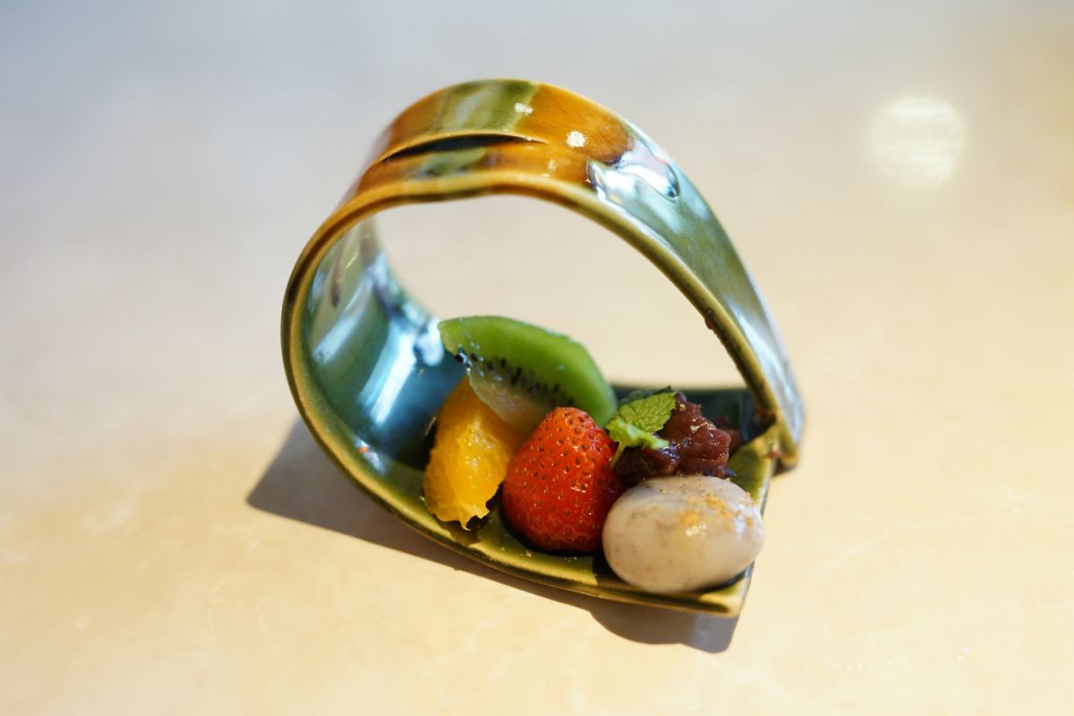 無農薬の黒米パウダーを練りこんだ白玉に、大納言あずきと季節のフルーツを添えて。白玉はオーダーが入ってから茹でるため、もっちもちの食感が楽しめます。