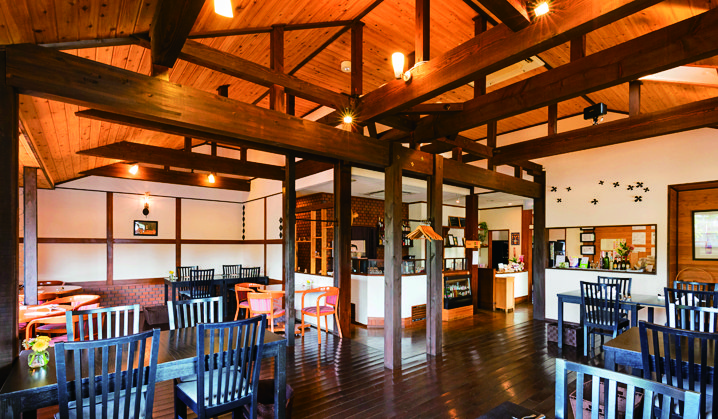 木を基調とした、落ち着いた雰囲気の店内、ウッドデッキのテラス席で食事をすることができます。