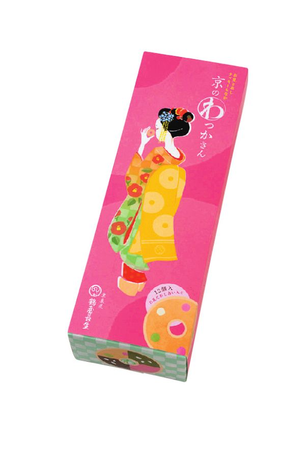 最中とクッキーを合わせた不思議な新食感の「京のわっかさん」はドーナツみたいでキュートな見た目。プレーン、抹茶、ほうじ茶、いちごの全4種が揃います。穴からのぞいて撮影した写真がSNSで話題です!