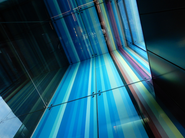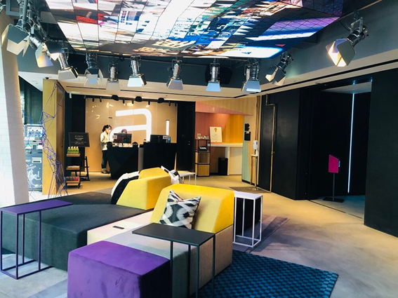 「アロフト東京銀座」のエントランスから“アロフトストライプ”というアロフトブランド共通のデザインが中に導いてくれます。アロフトは、アート×音楽×テクノロジーがコンセプトのライフスタイルホテルで、どこを撮っても絵になってしまうスタイリッシュさ。ロビーは、天井に銀座のいろんな風景がコラージュで映し出され、どこからともなく聞こえてくるのは銀座の雑踏で録音したサウンドです。