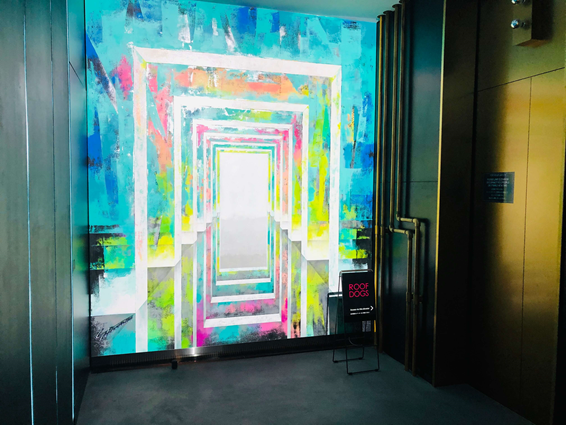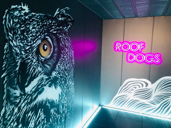 「アロフト東京銀座」でぜひ訪れたいのが、地上16階からの眺望とキュートなデザインのルーフトップバー。エレベーターホールを降りるとまずは大胆なポップアートが迎えてくれます。店名「ROOF DOGS」は、名物のホットドッグにひっかけたもの。外に出れば眼下に広がるのは銀座の眺望!