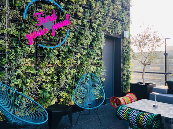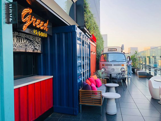 青やオレンジのガレージドアの上には「STAY SASSY(小生意気にいこうよ)」とネオンが輝き、グリーンやクッションでお洒落に寛げるコーナーも。ブルックリンで一杯ひっかけてるような気分にさせる都心のルーフトップに気分は上がりっ放し!