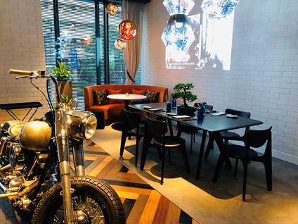 階にあるオールデイダイニング「THE WAREHOUSE」は、エクレクティクでインダストリアルなデザインのセミオープンキッチンのレストラン。ザハ・ハディッドがイギリスのインテリアブランド「トム・ディクソン」のためにデザインした照明を使い、ヴィンテージなハーレー・デビッドソンが置かれた店内は、とびきりクール。