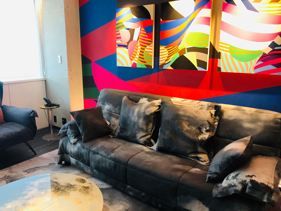 フロント奥のショップ「RE:FUEL」は、こだわって集めた見た目もかわいいスナックやアイスクリームなどが揃います。確かに元気のモト、FUEL(燃料)になりそう。そして、エレベーターホールの壁は、プロジェクションマッピングになっていて、ある時はペインティングの壁、ある時は光輝くゲートとどんどん変幻していきます。