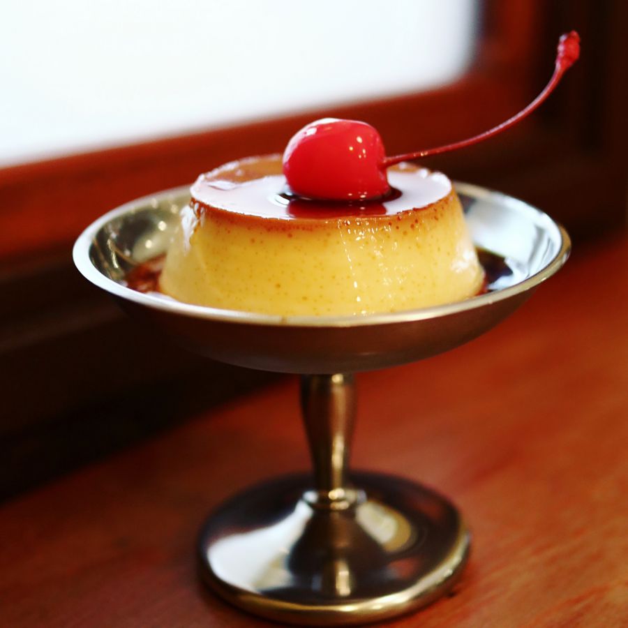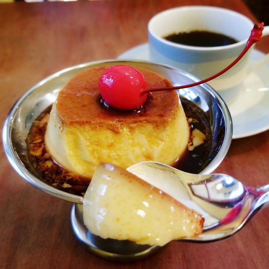ちょっと固めで、滑らかな卵感もしっかりある絶品プリン。たっぷりのほろ苦カラメルで、おいしさ倍増!上にのるシロップ漬けのチェリーも、昭和レトロ感が増してポイント高いです。