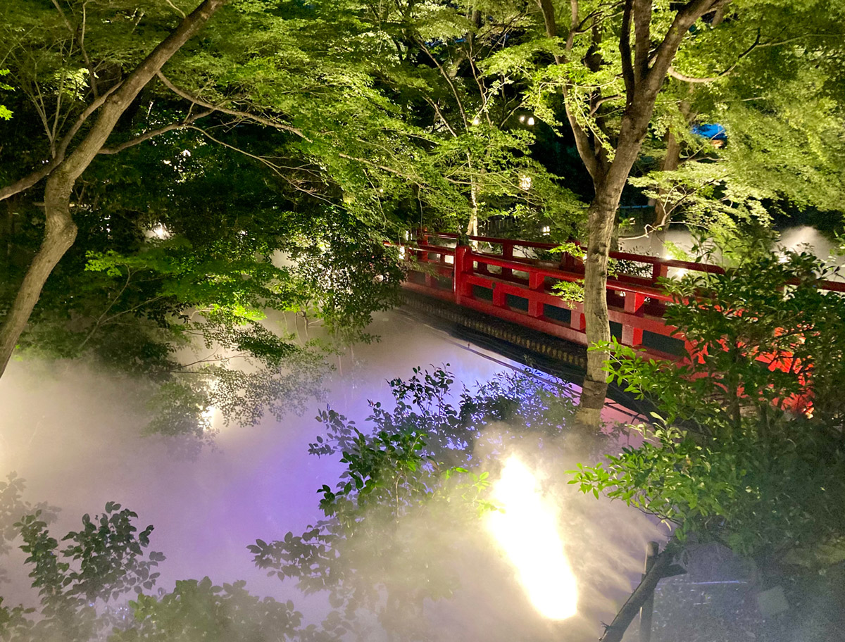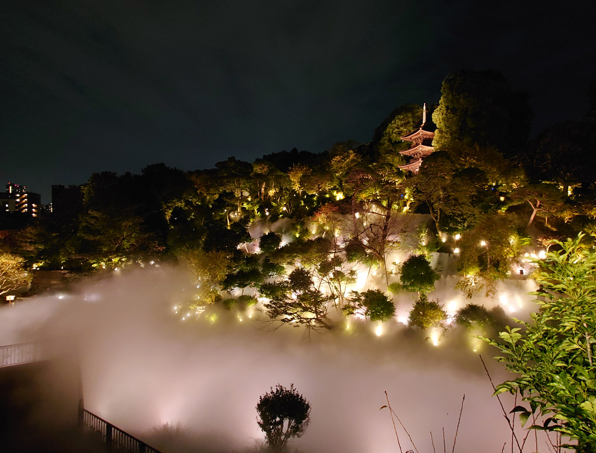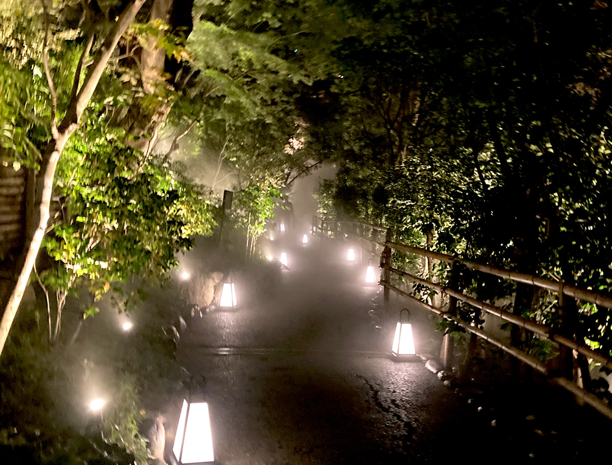 夜はライトアップされた庭園に漂う雲海が観賞可能。ぼんやりと灯る庭園を雲海が這い、まるで異次元にさまよい込んだよう。