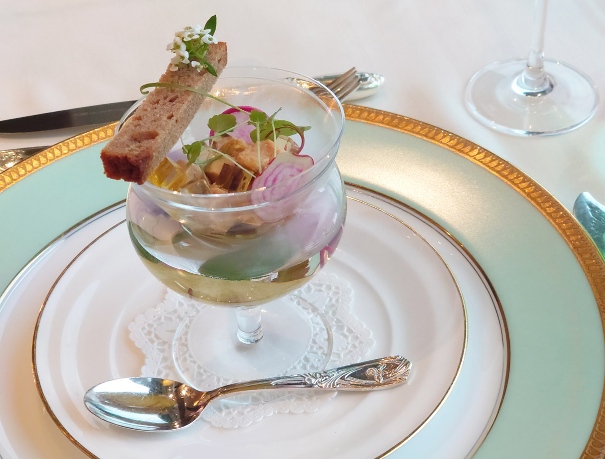 コースはホテル椿山荘東京で長らく愛された「レストランカメリア」の伝統の味に新しいテイストを織り交ぜたものや、雲海にインスパイアされたメニューで構成されています。東京雲海が一望できる席でホテル椿山荘東京自慢のフレンチをいただく贅沢なひととき。