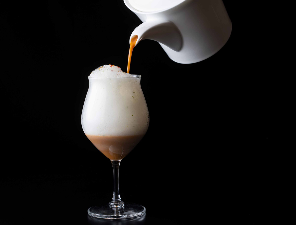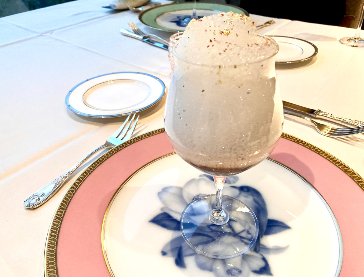 ふわふわとしたエストラゴンの泡が詰め込まれたグラス。またもや雲海の気分を盛り上げてくれます。そこに殻ごと煮出したオマール海老のビスクを目の前で注ぎ入れる一品。