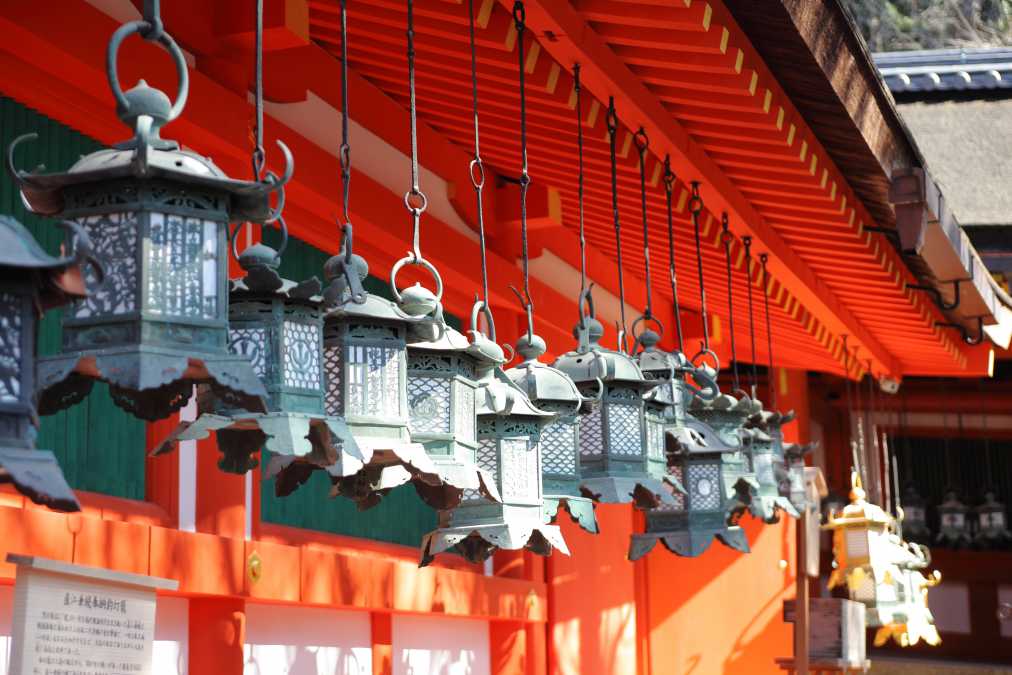 御本殿回廊内での特別参拝では、色鮮やかな朱の社殿や古い燈籠、4月下旬~5月中旬には山藤なども見ることができます。