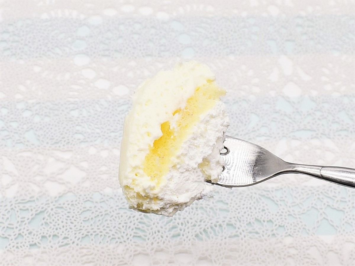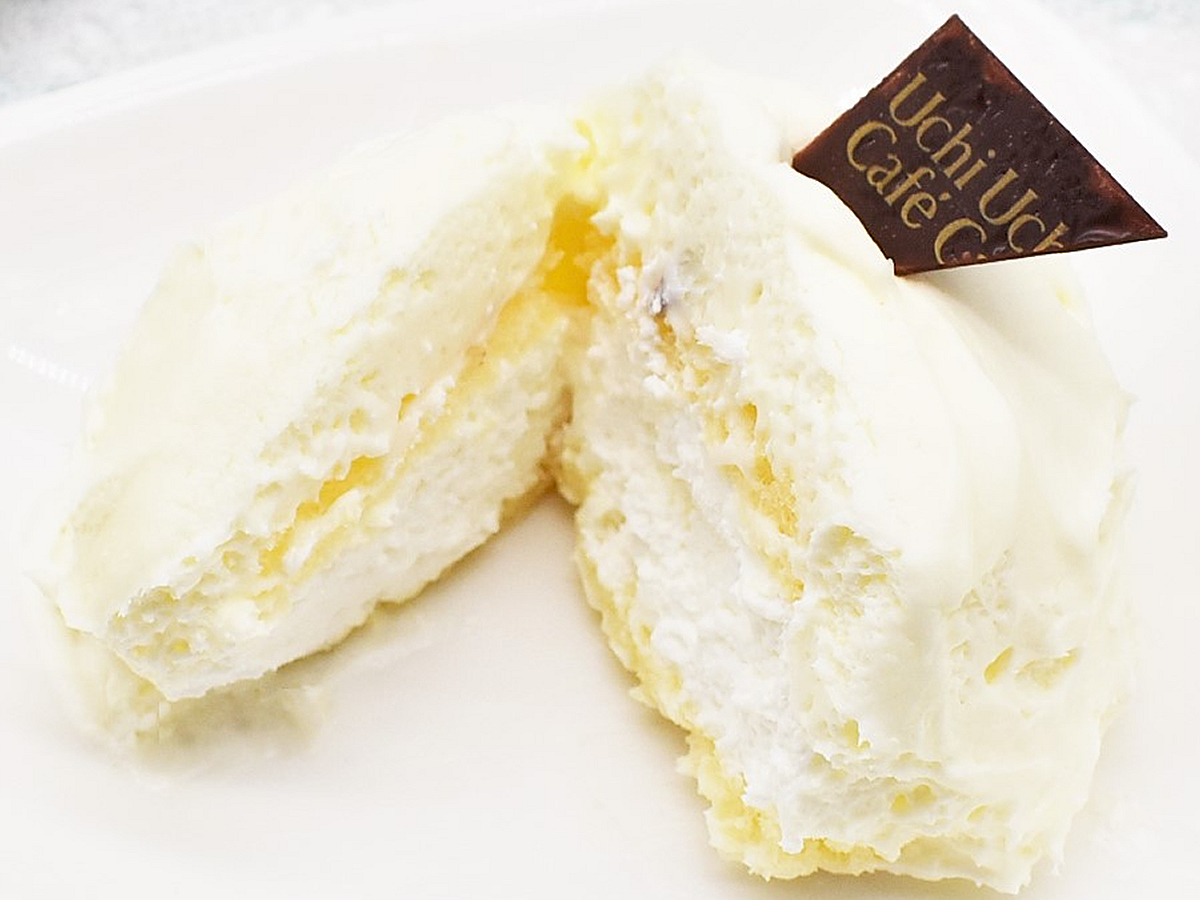 ではでは、さっそく実食開始! 一見クリームとスポンジだけの素朴なケーキ… と思いきや、このクリームにローソンの並々ならぬ“こだわり”が秘められていました。なんと外側と内側に2種類のクリームを使用。外側は北海道産の牛乳を配合したクリームでコーティングし、内側に爽やかな風味のクリームを使用しています。いくら食べても飽きがこないうえ、口どけの良いなめらかさを実感。おまけにクシュっと泡のような軽さのクリームが、まさに“雲泡”という名にふさわしい口当たりです。