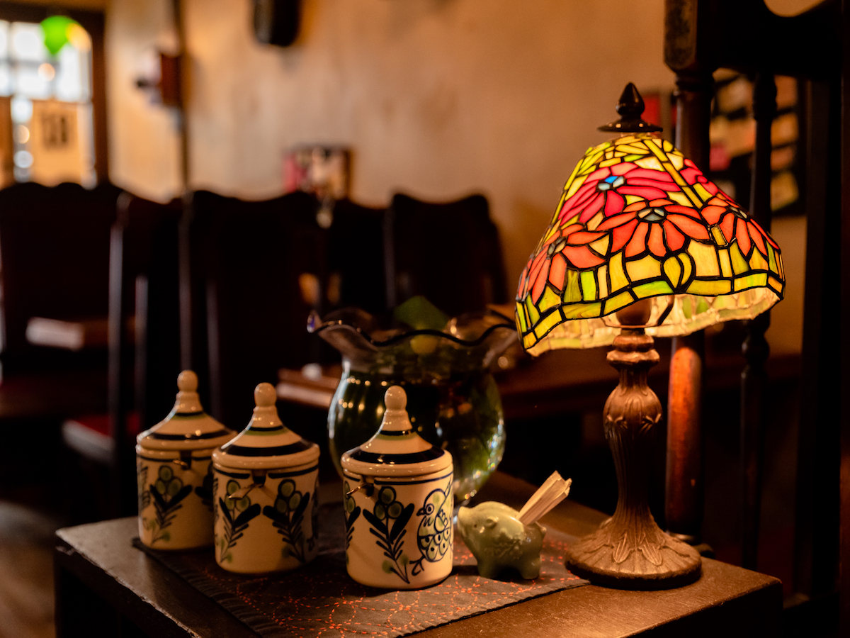 ステンドグラスのランプシェードや古時計など、アンティークの調度品はオーナー自ら集めたもの。壁にかかったメニューでさえもレトロ!