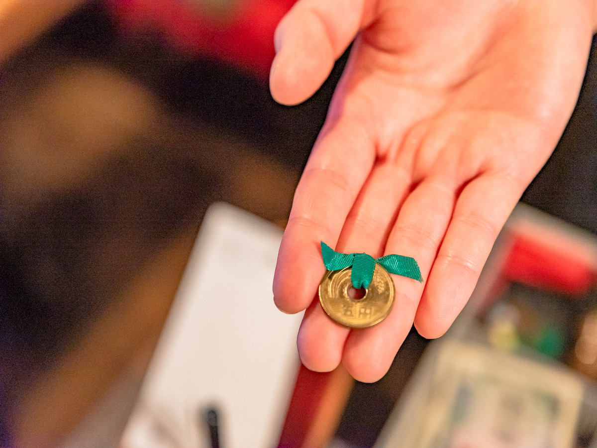 お店のことを思い出して欲しい、ご縁がありますようにと、リボンが付いた5円玉をお釣りでもらえます。創業当時から続く、ちょっとした心使いが長年愛される所以のひとつなのかも知れません。ちなみに、5円玉のお釣りが出やすい価格設定なんですよ。