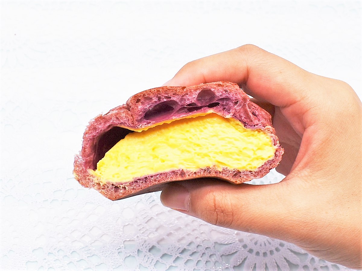 はやる気持ちをおさえつつ、さっそく実食していきましょう。半透明のパッケージを開封すると、紫色のシュークリームがお目見え。まるでさつまいもを彷彿とさせる可愛らしい見た目なうえ、小ぶりなサイズ感も魅力的です。おまけに安納芋の香りを強く感じることができ、一層食欲がそそられます~。