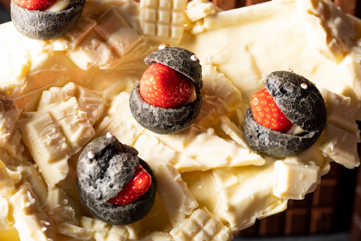 提供される約20種類のイチゴスイーツは「ゴジラ」の世界観をスイーツで表現しており斬新。なかでもゴジラの顔をモチーフにした「イチ・ゴジラ シュークリーム」は、竹炭で黒く焼いたシュー生地に、イチゴを丸ごと一つ入れた、見た目にもインパクト大!料理には、人気の高いローストビーフをはじめとした、約30種の豊富なランチメニューがいただけます。 ほかにはないちょっと変わったストロベリービュッフェ。SNSにUPしたら話題になりそう。