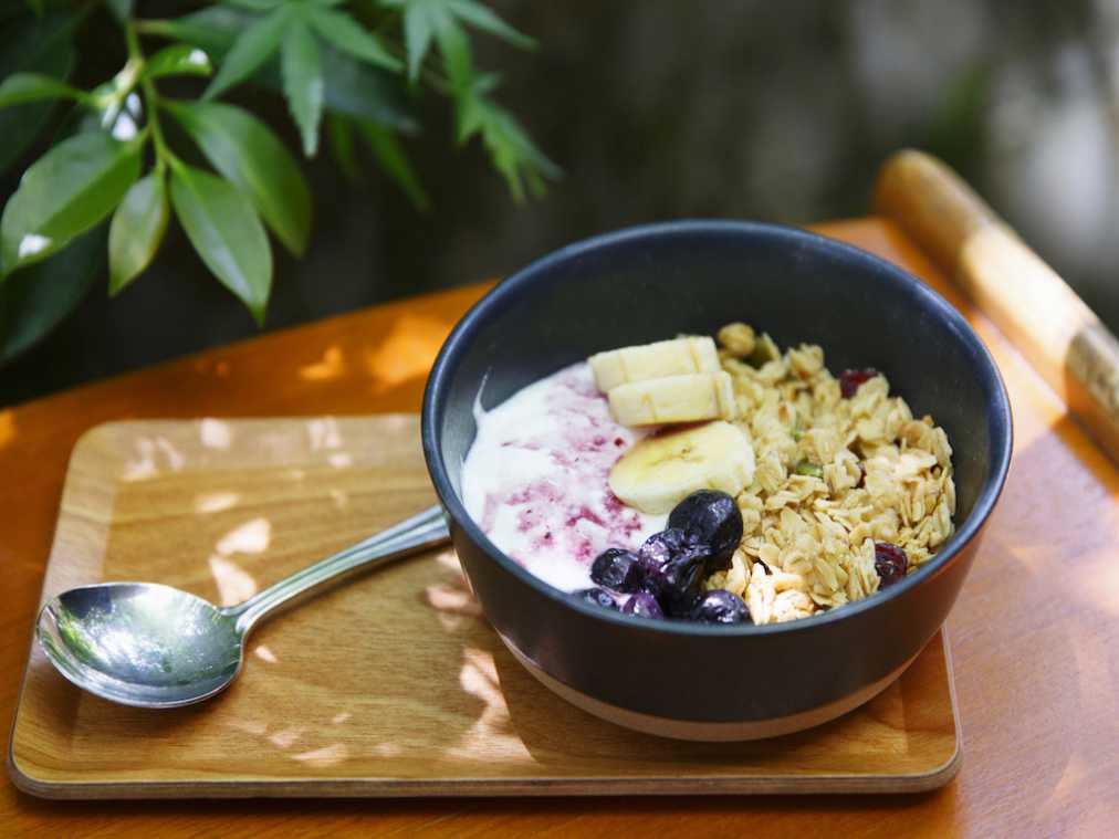 「伏見稲荷大社」のお山めぐりで疲れた体を癒してくれるのが手作りの食事メニュー。写真はオーツやクランベリー、くるみなどがたっぷり入った「自家製グラノーラ フルーツ添え」(734円)です。