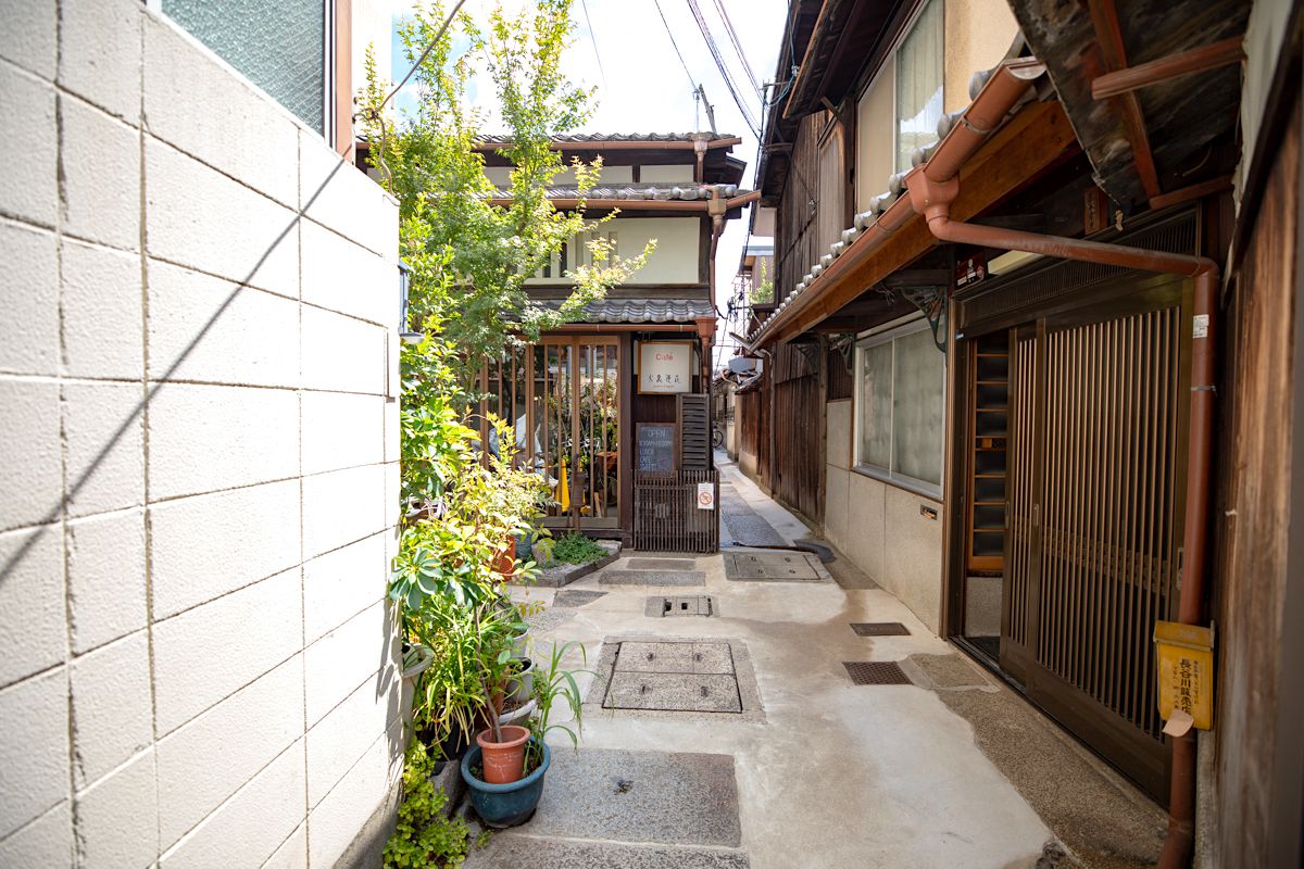 平安時代、碁盤の目状に整備された京都の街。区分された内側の土地を利用するためにできた袋地(通り抜けできない路地)が多いのは、京都の街の特徴でもあります。「cafe火裏蓮花」があるのも、そんな袋地のなか。京町家の特徴である“虫籠窓”も残っていますね。