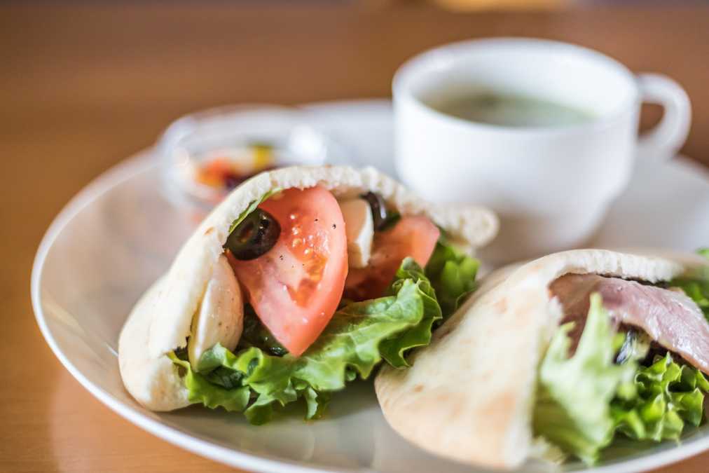 みずみずしさが写真から弾けてきそうな野菜たっぷりの「ピタパンサンドセット」(1400円)。この日のスープは春菊です。