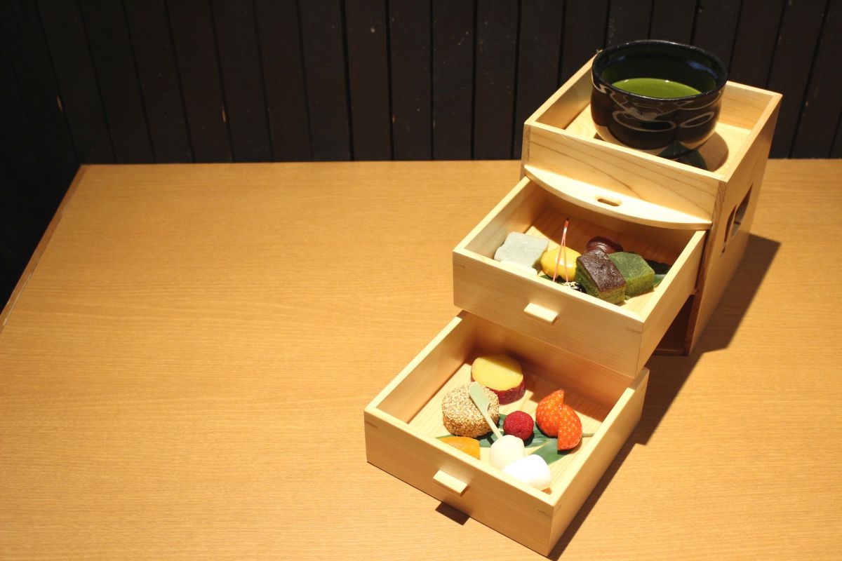 宇治の上質なお抹茶をたっぷり使った「一葉フォンデュ」。お重が引き出しのようになっていて、中には何が入っているのかな?とわくわく!