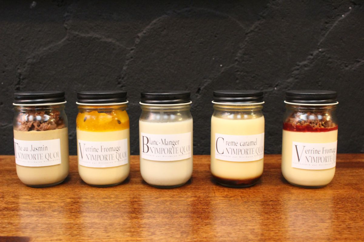 見た目にもおしゃれな瓶入りスイーツは全部で5種類。北海道産の濃厚な牛乳と、錦市場に店を構える三木鶏卵の卵を使ったシンプルなプリン「クレーム・カラメル」(写真右から2番目・380円)をはじめ、チャイのような味わいの「ジャスミンティーのクレーム」(写真左端・530円)、香りのよい宇治産の特上ほうじ茶を使った「ほうじ茶ブランマンジェ」(写真中央480円)などがあります。