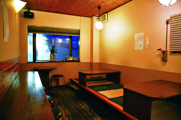 座敷とカウンター席を備える小ぢんまりとした店内。
