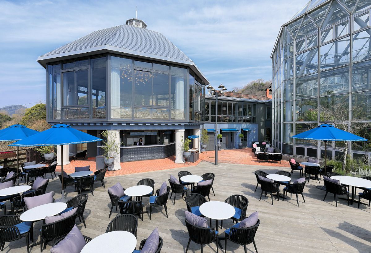 新神戸駅近くのハーブ園山麓駅からロープウェイで約10分。山頂駅に降り立つと目の前に広がるのは、四季折々の花やハーブが咲き集う日本最大級のハーブ園「神戸布引ハーブ園」です。山肌に沿って園内を進むと、標高400mの高台に現れる「THE VERANDA AT KOBE」。