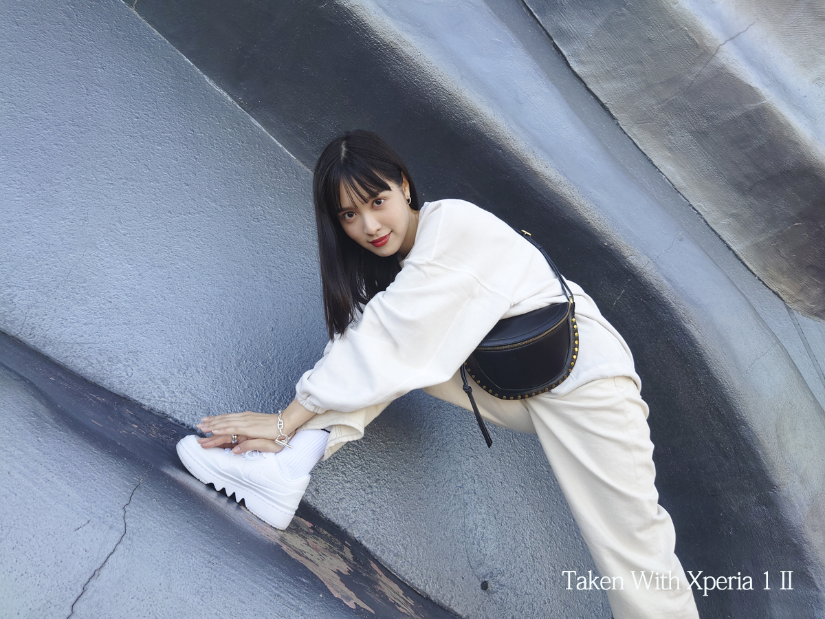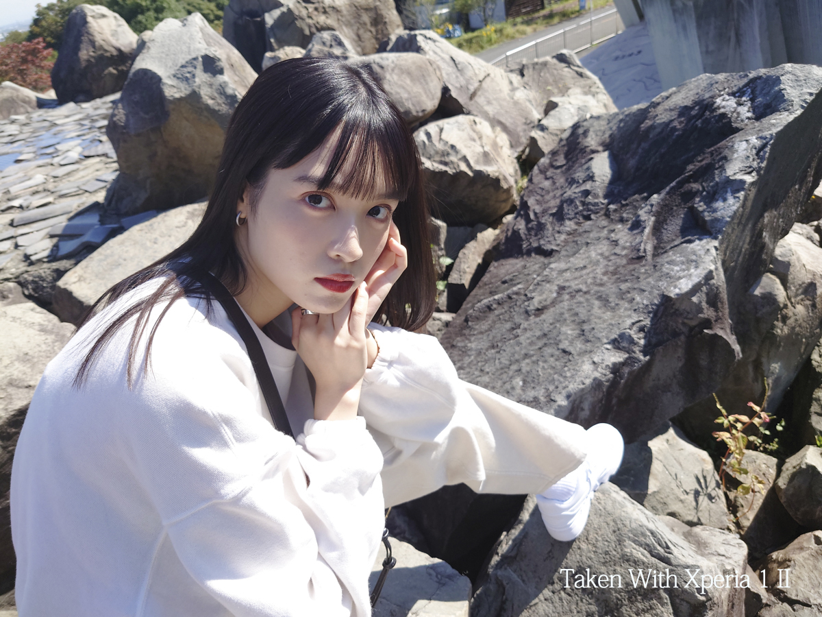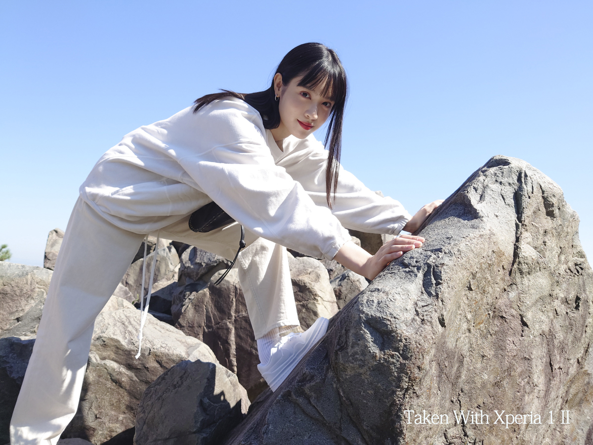 険しい岩場を必死に登る松本さん……と思いきや、実はそれほど高さはなく、軽やかな足取りで、数分後には山頂に到着しちゃいました。写真の撮り方ひとつで険しい岩山を演出できるユニークなオブジェ。Xperia 1 IIがあれば、大きく身体を動かすシーンも、岩を登るかのような迫力ある接近したシーンも美しくバッチリ撮ることができますよ。