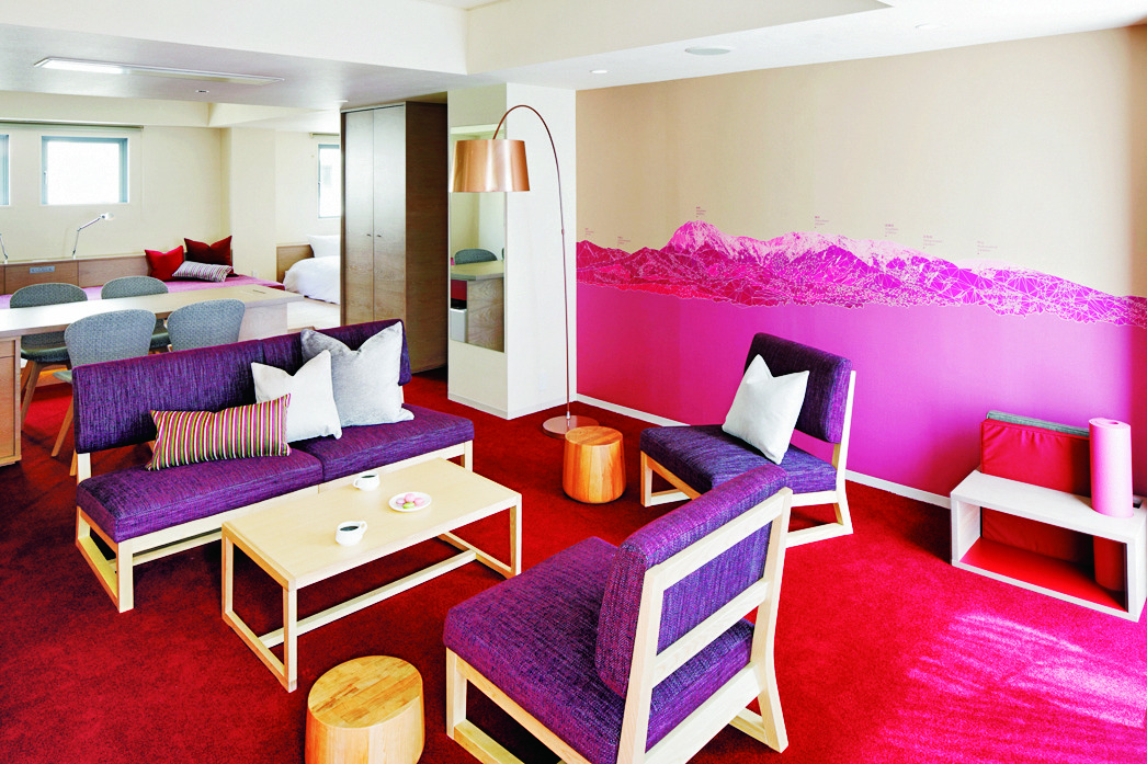 客室はボルドーカラーの大人な雰囲気が素敵です。八ヶ岳連峰を描いた壁画も印象的。