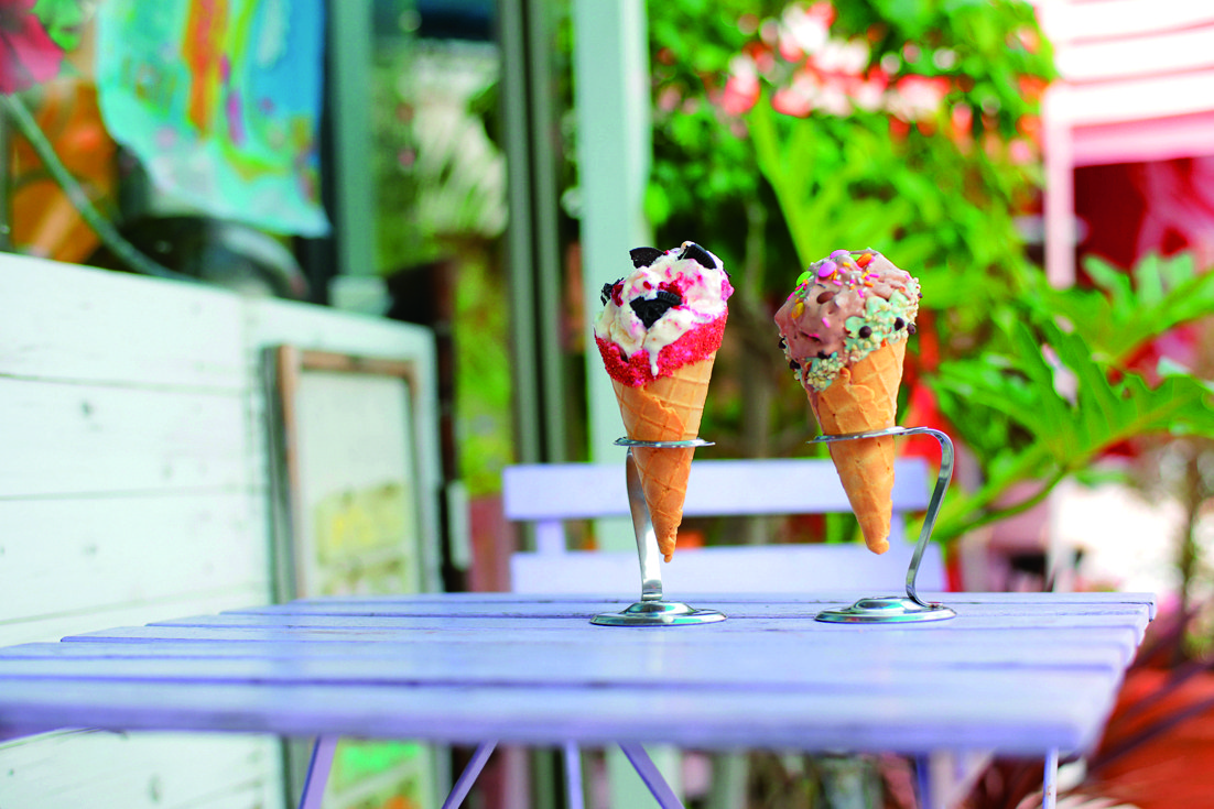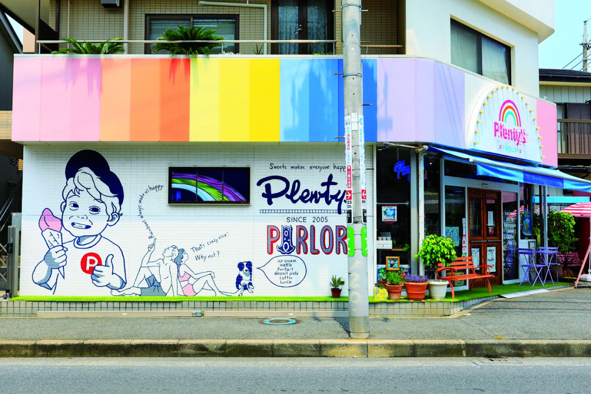 地元の人から愛されるアイスクリーム店が「プレンティーズ 茅ヶ崎本店」。外観は茅ヶ崎在住の水彩画家・かとうくみさんのイラストと、石井千晶さんのステンドグラスが目を引きます。マイナス20℃の大理石の上で、アイスとトッピング2種類を混ぜ合わせるプレンティーズアイスが食べられるのは本店のみ!