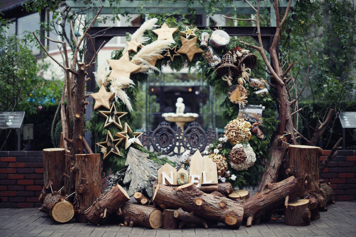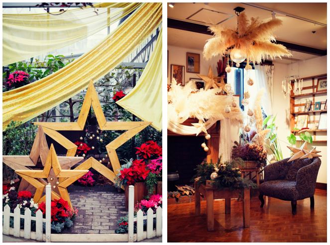 「クリスマスガーデン」は、木製の星のオーナメントやポインセチア、プリンセチア、シルバーリーフで。「ハーブの家」は、ドイツトウヒやモミノキ、パンパスグラスなどの自然素材でおしゃれに彩られます。