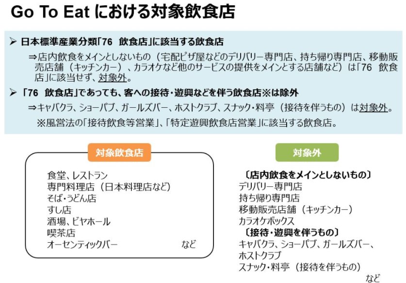 対象となる飲食店は、食堂、レストラン、専門料理店、そば・うどん店、すし店、酒場、ビヤホール、喫茶店、オーセンティックバーなど。(デリバリー専門店、移動販売店舗、カラオケボックス、キャバクラ、ホストクラブ、スナックなどは対象外です)。参加登録店舗には、感染予防対策に取り組むことを条件とし、利用者にも「新しい生活様式」に基づいた利用を呼びかけます。